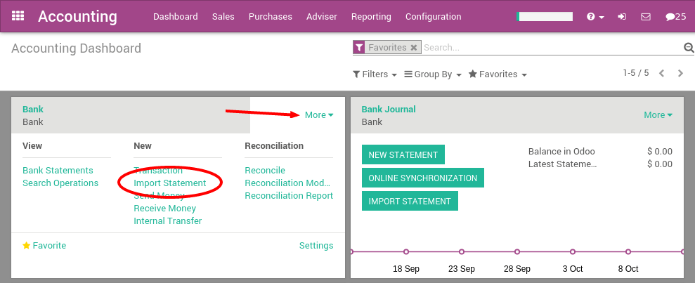 Después de haber importado el primer archivo, el tablero de instrumentos de contabilidad de Odoo propondrá automáticamente importar más archivos de su banco. Para la próxima importación, no es necesario acceder en el botón de Más, ya que se puede hacer clic directamente en el enlace Importar Declaración.